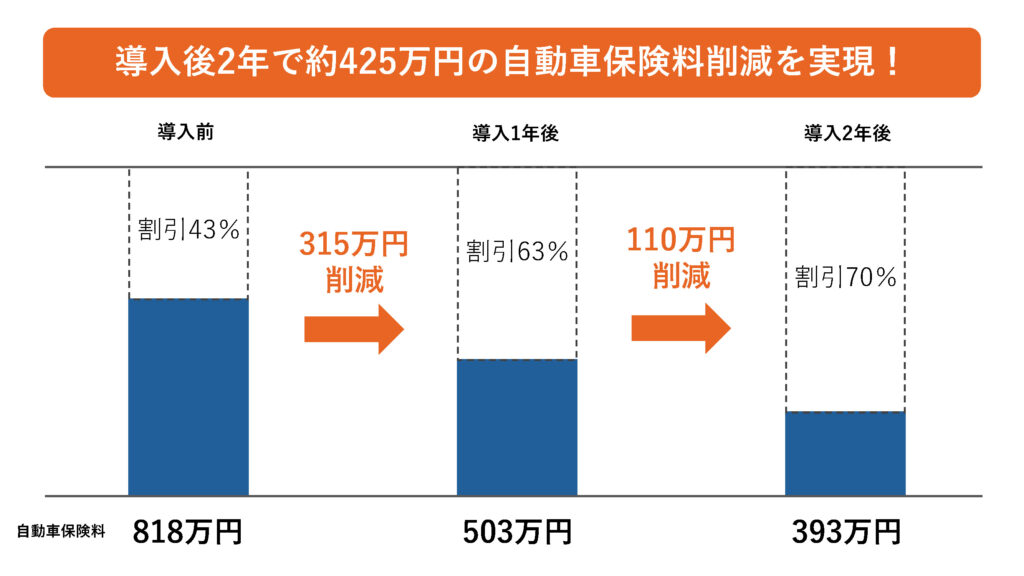フリート契約250台の企業で現在有料割引43%の場合、事故削減によって毎年30%ずつ支払保険金が減ると初年度315万円削減、次年度110万円削減、2年で合計約425万円の自動車保険料の削減が可能です。